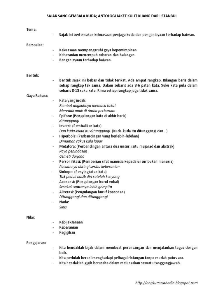 Teknik ingat kata kunci dengan mudah dan pantas teknik menjawab komsas mengikut standard spm #cikgulindarnor #gurucemerlangbm #cikgootube. Sang gembala kuda ialah seorang lelaki yang gagah. Temukan lagu terbaru favoritmu hanya di lagu 123 stafaband planetlagu. 2,pemimpin ialah seorang yang berkuasa di negaranya. Penerangan sajak sang gembala kuda tingkatan 4. Persoalan kesetian kuda kepada penjaga kuda kerana makanan yang diberikan. Sanggembala kuda mohd hashim othman. Komponen sastera dan novel bm / bahasa melayu. Sajak sang gembala kuda mohd hashim othman. Nyatakan dua lambang kekuasaan sang gembala kuda. Pada pendapat anda, bagaimanakah seorang pemimpin mengukuhkan kekuasaannya? This content is for members with subscription. Huraikan 4 pengajaran yang terdapat dalam sajak ini?